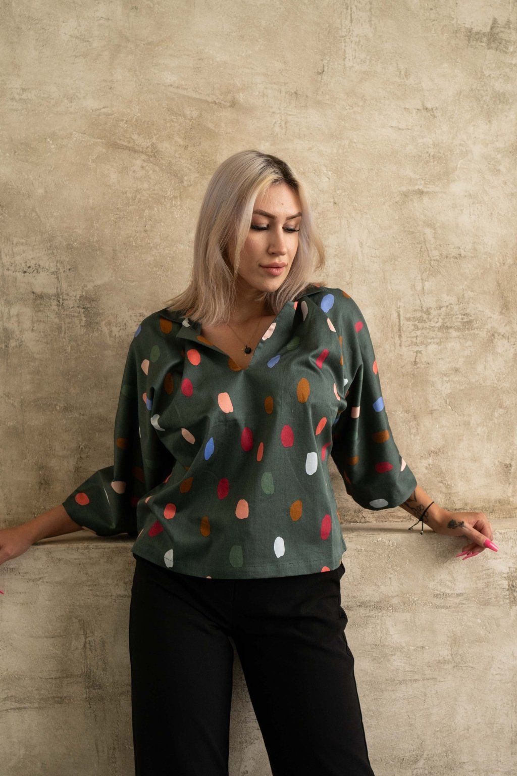 Jako bohyně! Halenka je ušitá tak, abyste se v ní cítili svobodně, nikde netahá ani neškrtí a má široké spadnuté rukávy, takže 100% pohodlí zaručené.