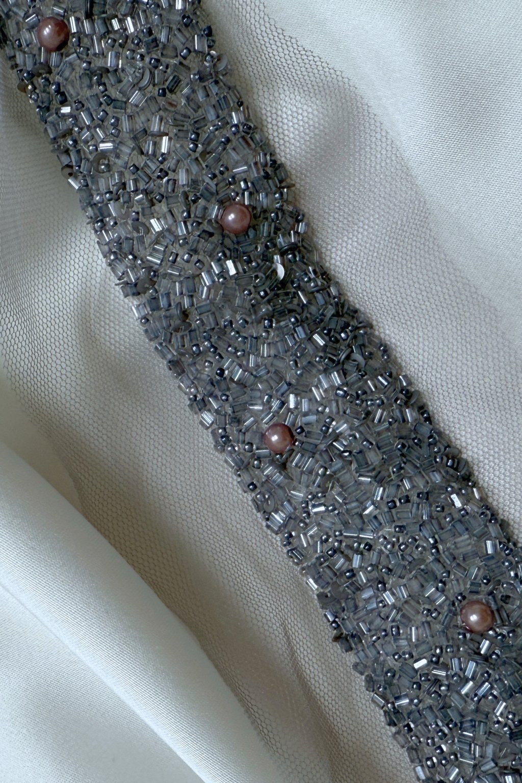 Tato výjimečně zdobená borta dodá vašim šatům nádech elegance a luxusu. Bohatě vyšívaný pruh s perličkami, korálky a kamínky je ideální k dozdobení živůtku, pasu, rukávů, vlečky nebo závoje.