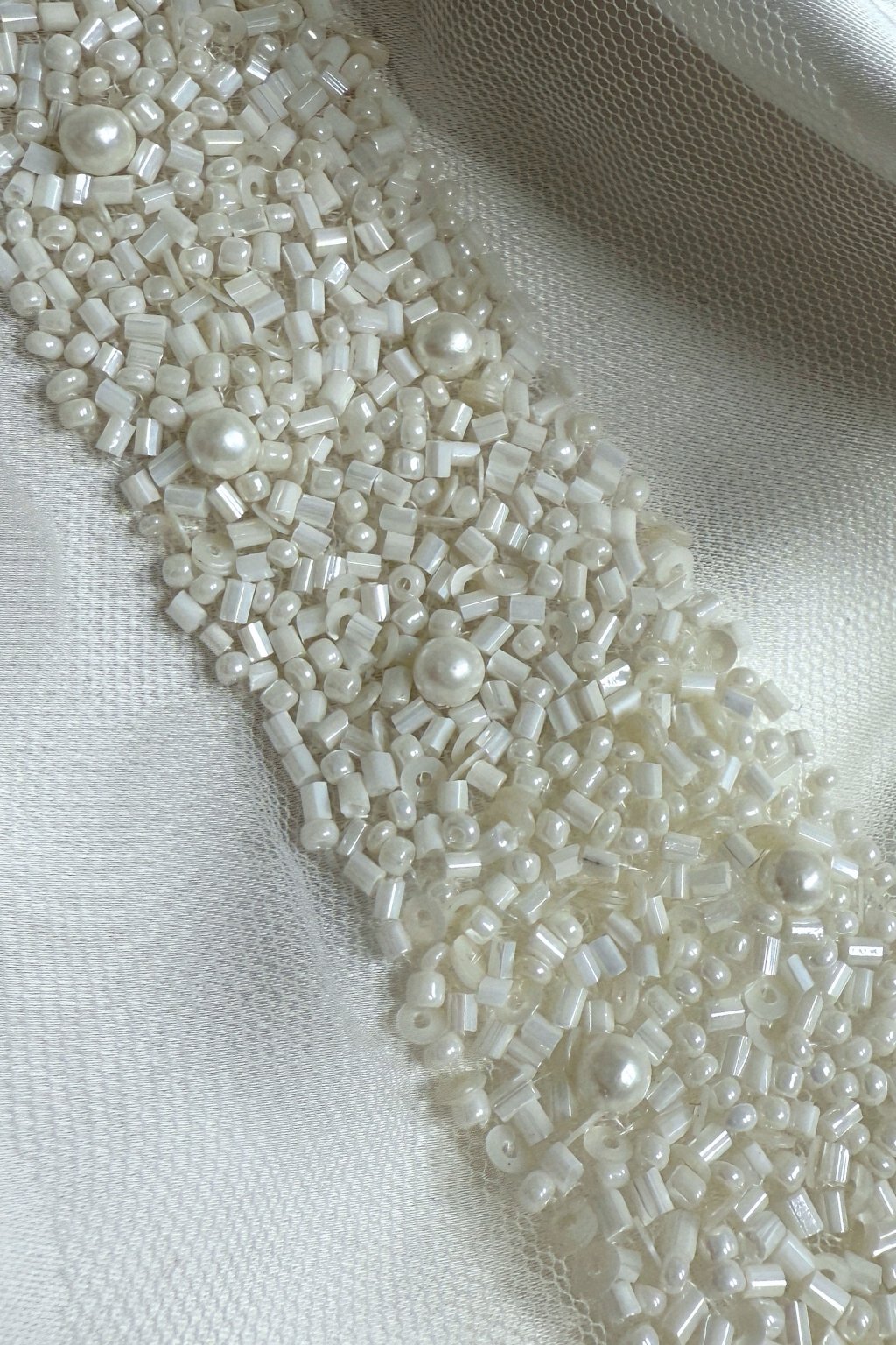 Tato výjimečně zdobená borta dodá vašim šatům nádech elegance a luxusu. Bohatě vyšívaný pruh s perličkami, korálky a kamínky je ideální k dozdobení živůtku, pasu, rukávů, vlečky nebo závoje.