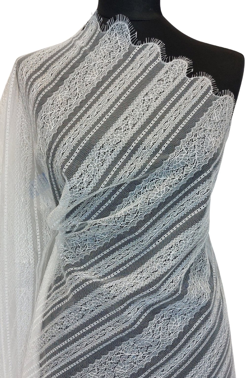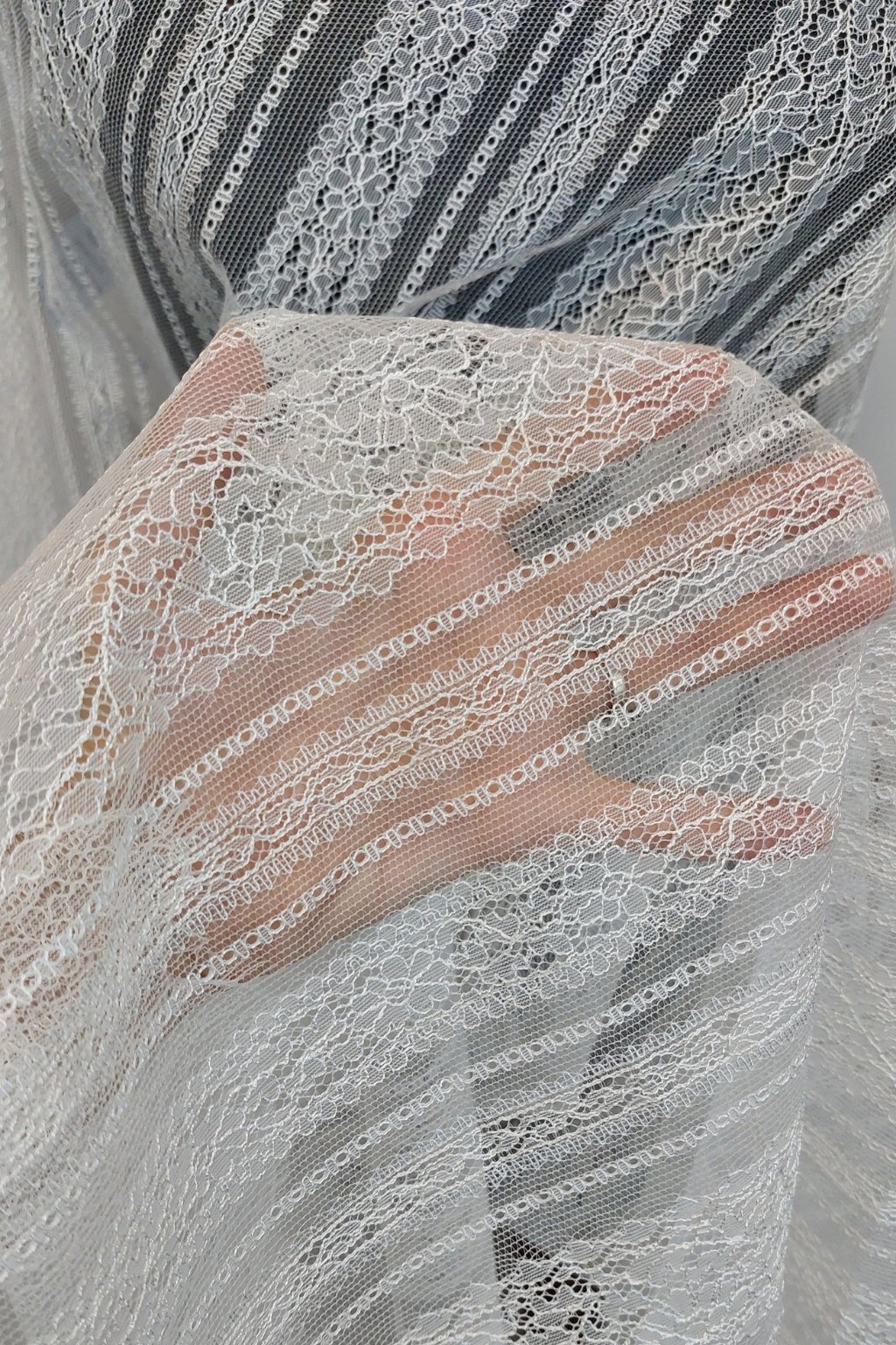 Na dotek je francouzská krajka lehoučká, splývavá a velmi příjemná, s nádherně zřetelnou kresbou. Může být jemně pružná, doplněná o vyšívané detaily, perličky, korálky nebo jemný lesk. Vždy působí výjimečně – ať už tvoří celé šaty, nebo jen decentní detail.