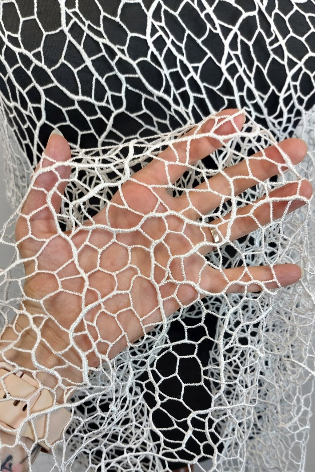 Na dotek je jemně strukturované, pevné, ale zároveň poddajné, což umožňuje vytvářet detailní vzory a efektní průhledné plochy. Díky svému vzdušnému vzhledu působí bohémsky, romanticky a nadčasově elegantně.
