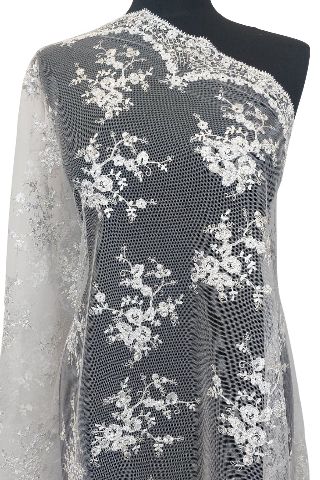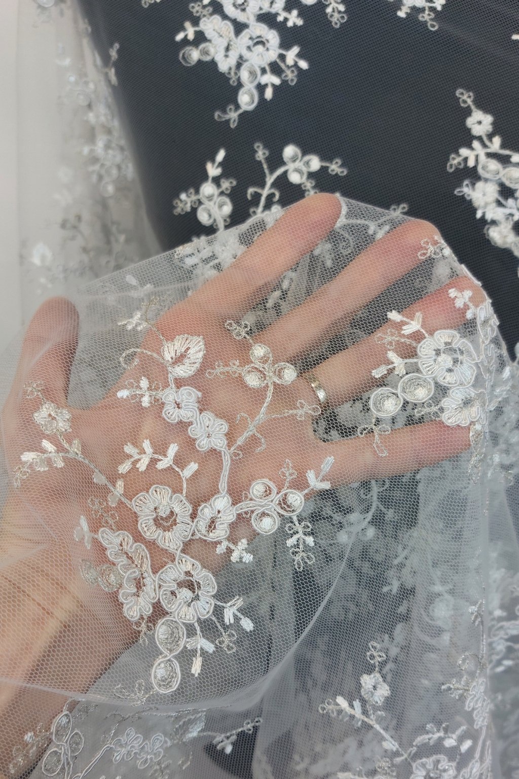 Na dotek je lehký, vzdušný, ale díky sutašce získává jemně plastický a pevnější vzhled. Výšivka vytváří nádherné ornamenty, které dodávají šatům či doplňkům noblesní charakter. Perfektní pro slavnostní modely, které mají upoutat pozornost.