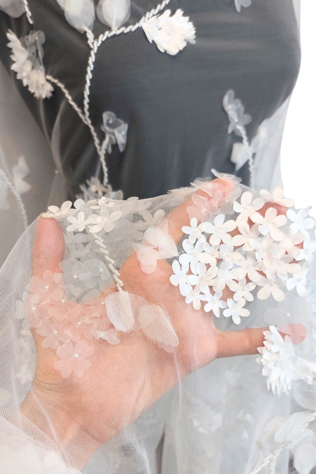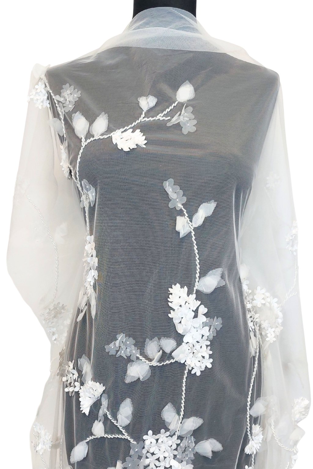 Na dotek je jemný, ale bohatě strukturovaný díky pečlivě aplikovaným ozdobám. Přináší luxusní efekt, který dělá z každého modelu mistrovské dílo. Perfektní na gala večery, svatby nebo módní přehlídky.