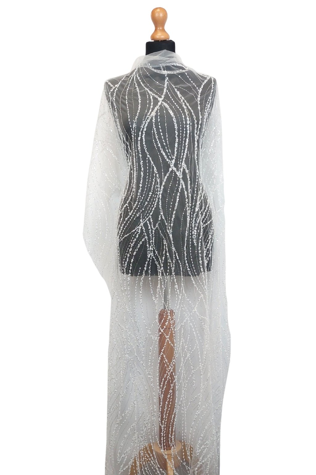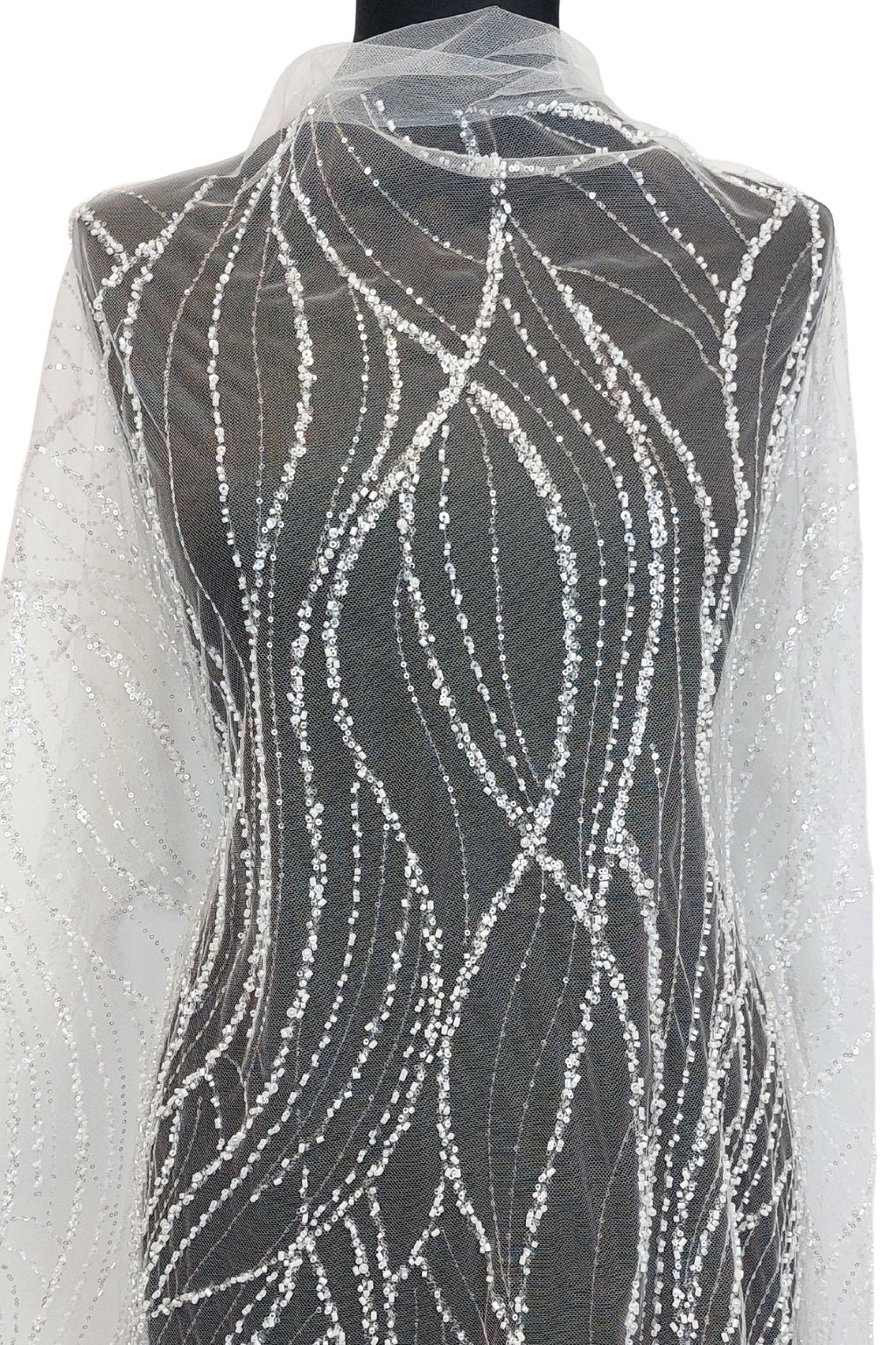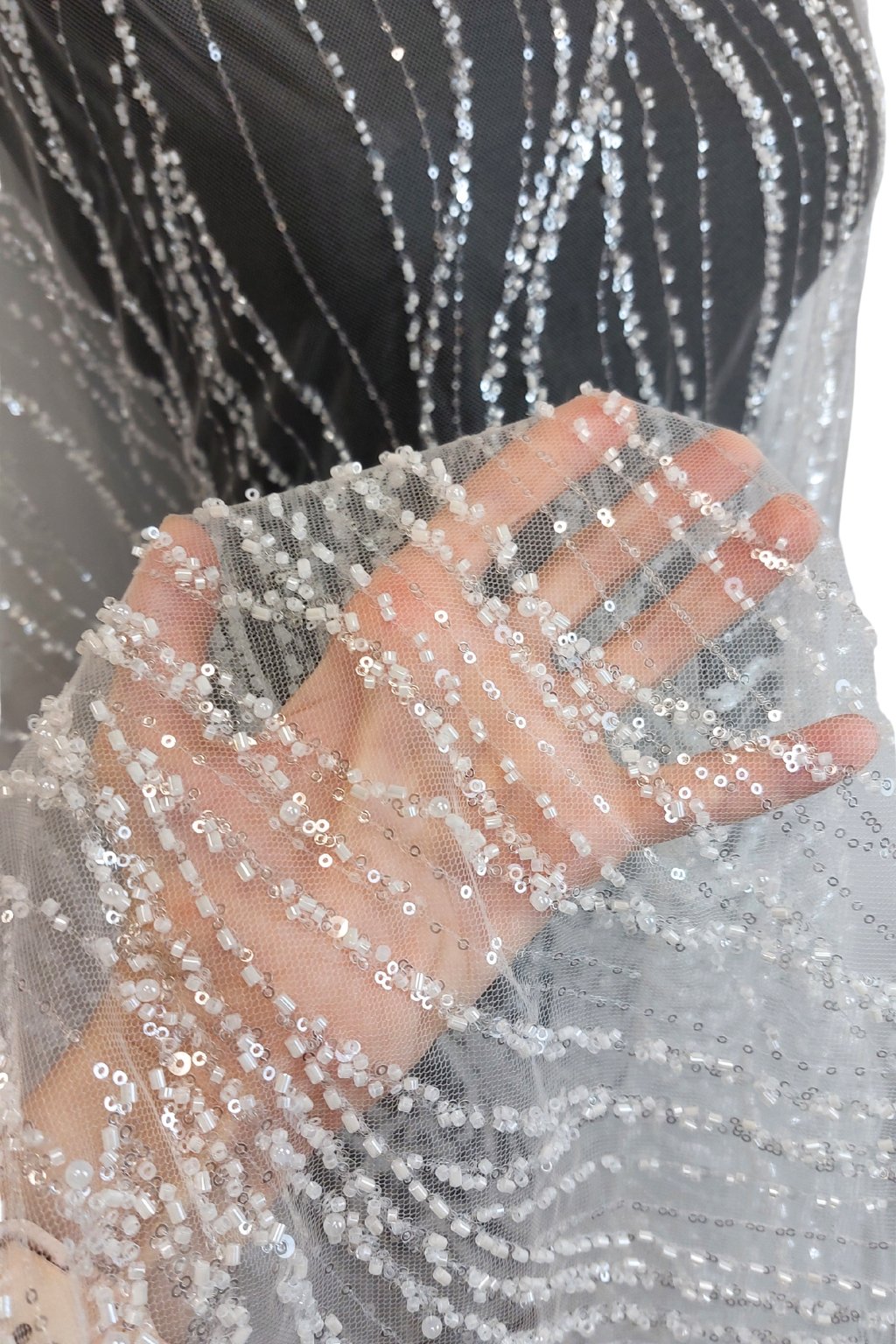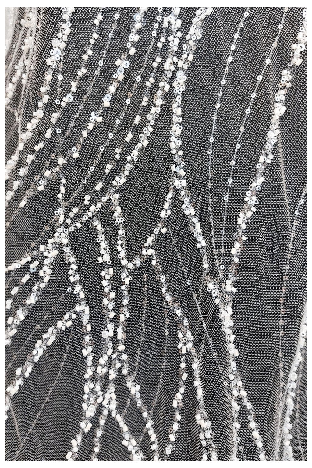 Na dotek je jemný, ale bohatě strukturovaný díky pečlivě aplikovaným ozdobám. Přináší luxusní efekt, který dělá z každého modelu mistrovské dílo. Perfektní na gala večery, svatby nebo módní přehlídky.