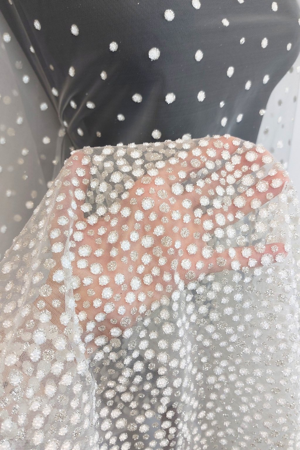 Na dotek je jemný, ale bohatě strukturovaný díky pečlivě aplikovaným ozdobám. Přináší luxusní efekt, který dělá z každého modelu mistrovské dílo. Perfektní na gala večery, svatby nebo módní přehlídky.